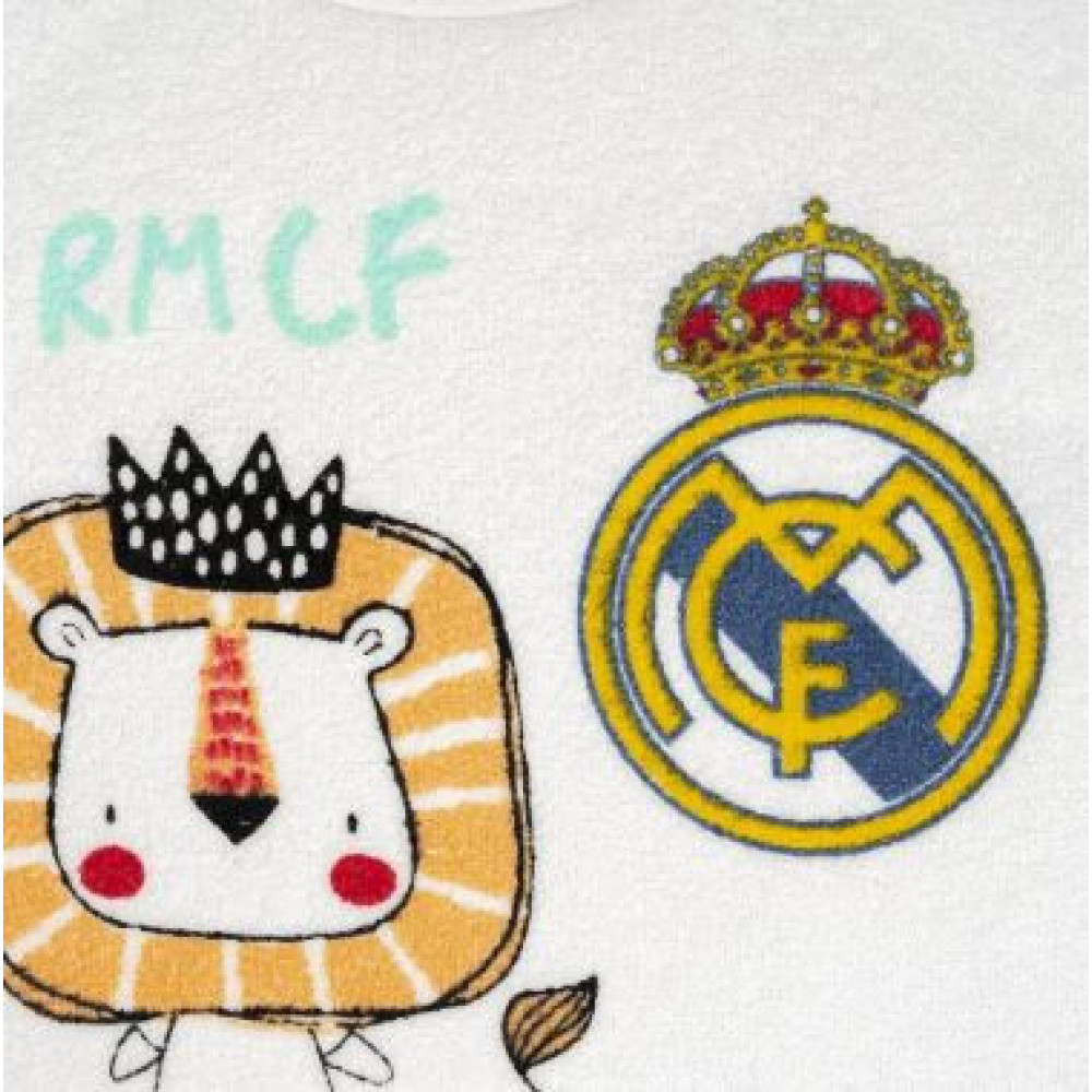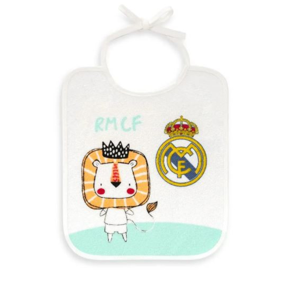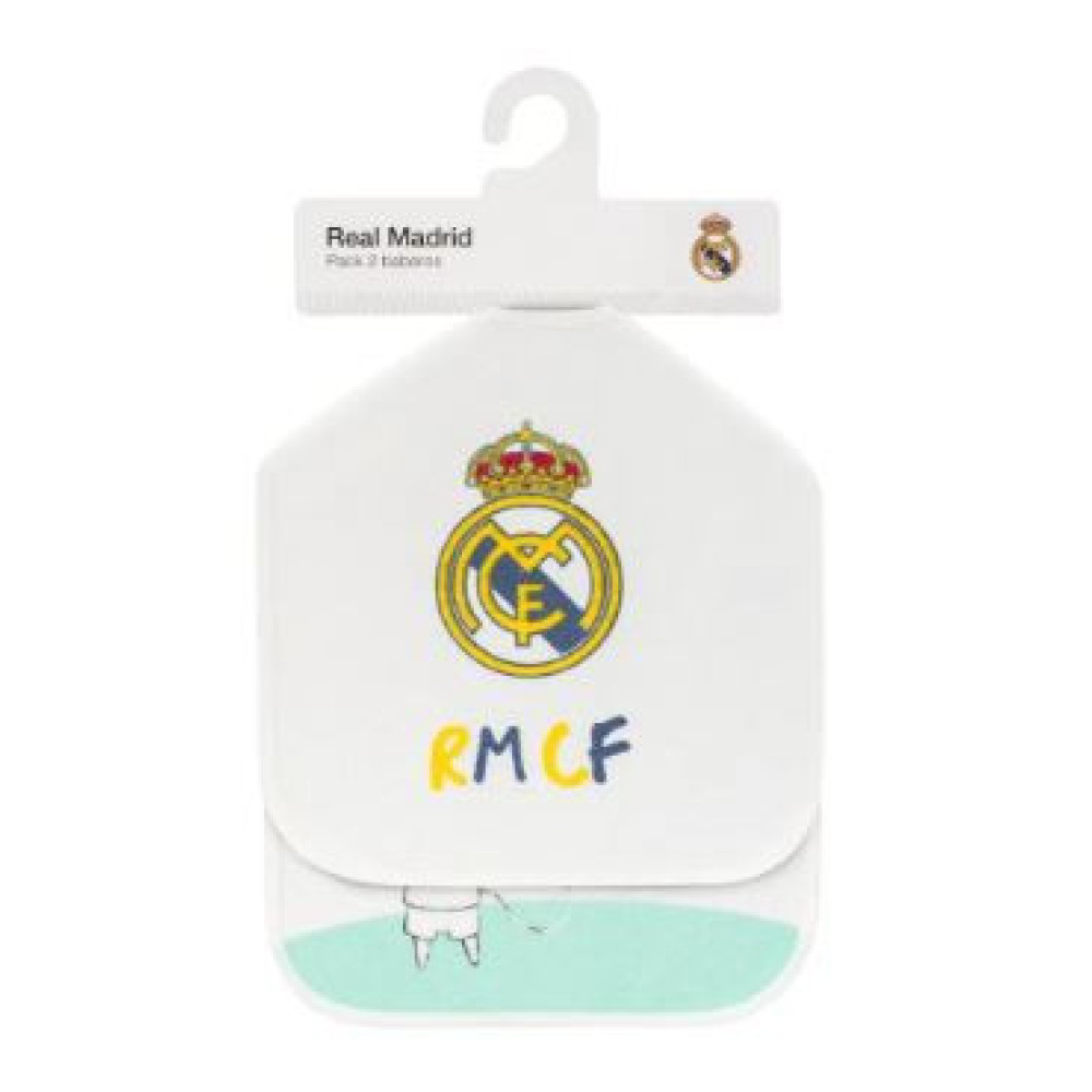 Pack de 2 baberos cuadrados de rizo plastificado, del Real Madrid. Pack de 2 baberos con reverso plastificado, para evitar que el bebé se manche mientras come. Uno de los baberos lleva el dibujo de un león y el escudo del Real Madrid, y el otro el escudo con las letras RMCF debajo. Contorno y cintas de color blanco. Cuenta con dos cintas para atar al cuello, muy cómodo y fácil de poner, ideal para los primeros meses de vida del bebé.