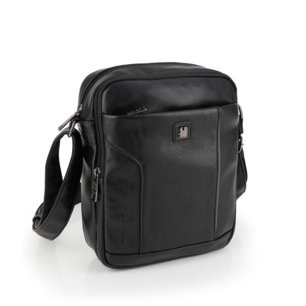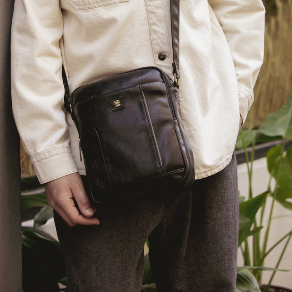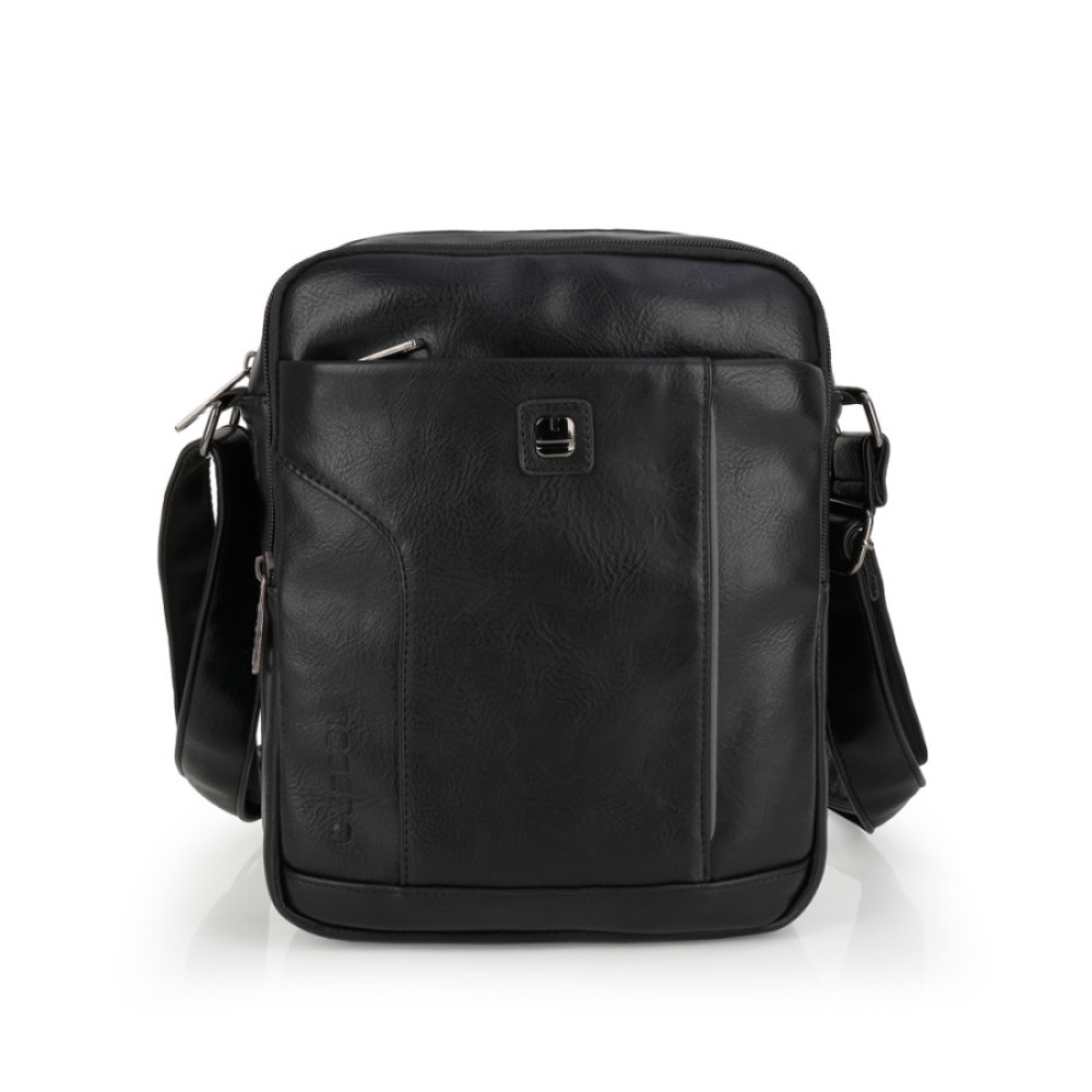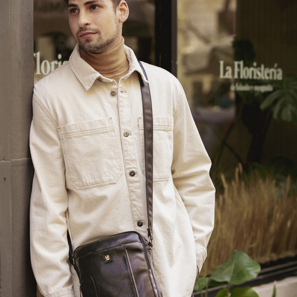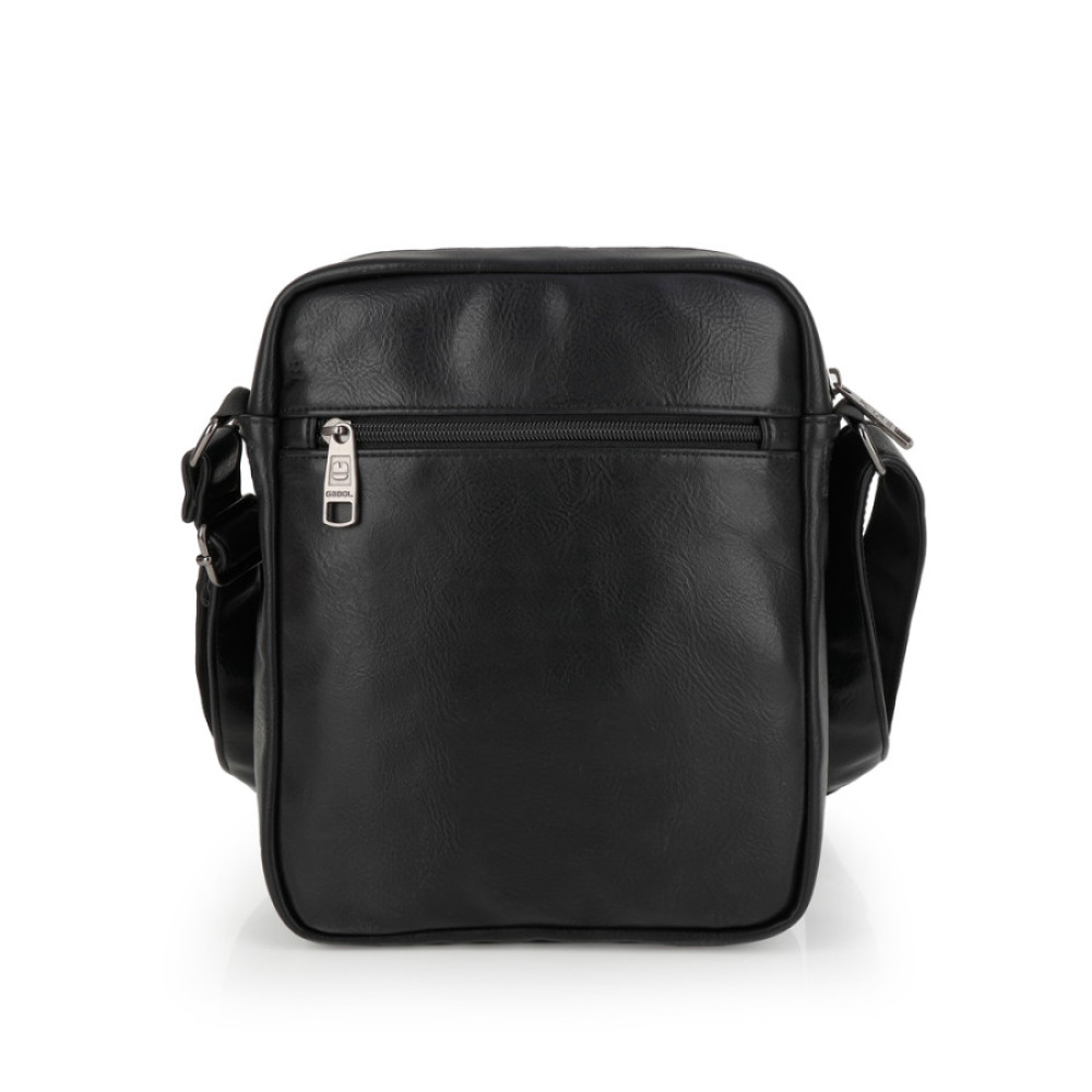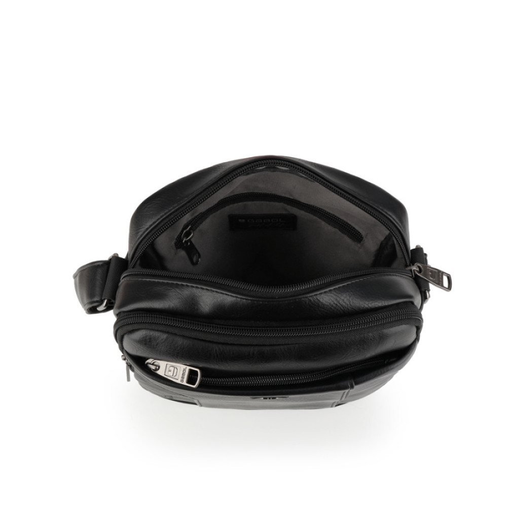 Bandolera de piel sintética, negro, con dos compartimentos. Fabricado con materiales libres de PVC. Medidas: 20x25x8 cm