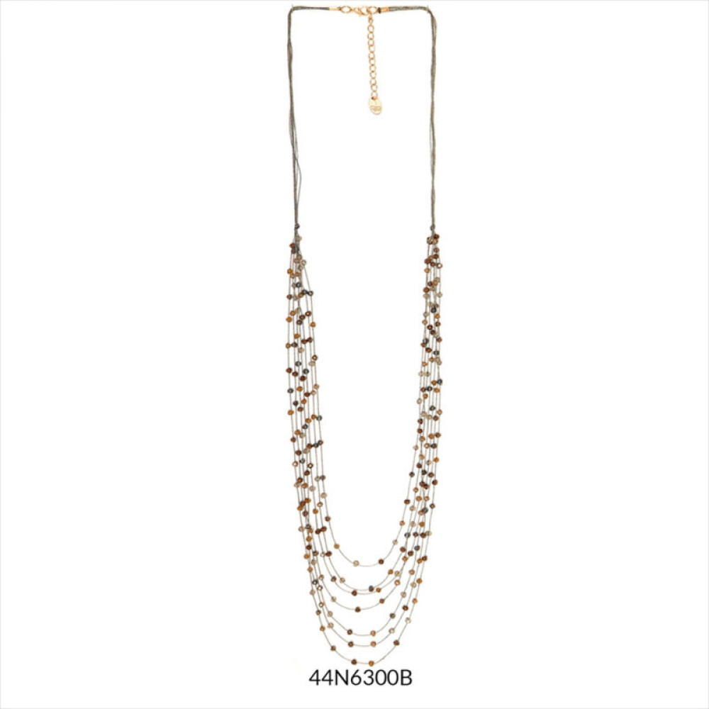 45% hilos de nylon, 45% cristales y 10% hierro (cadena de extensión) libre de cadmio, plomo y níquel. Hipoalergénico. 90 cm de largo. 6 cm de cadena de extensión.