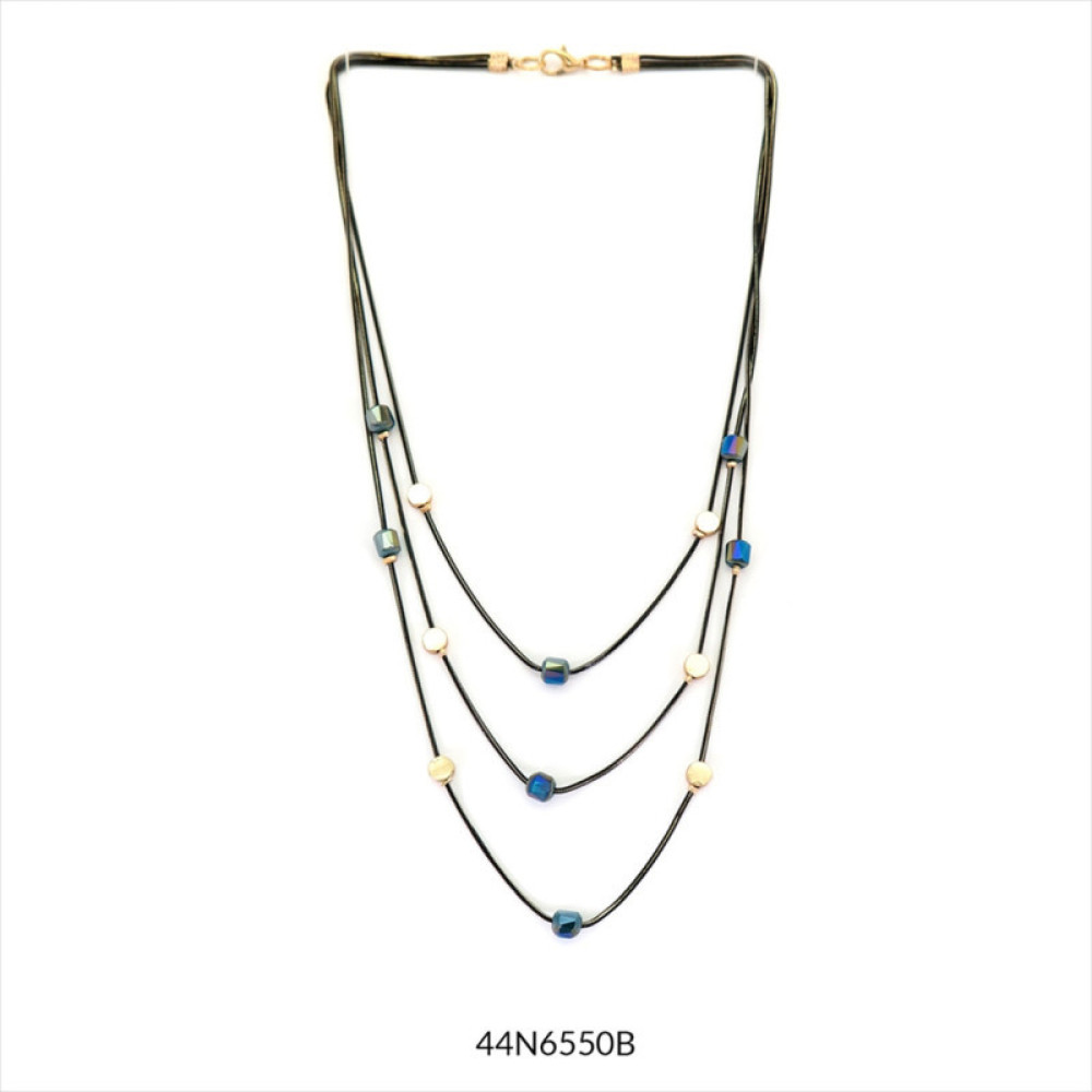 30% cristal, 40% cobre ( cadena) y 30% aleación de zinc (adornos, cadena de extensión y lobster). Metal libre de cadmio, plomo y níquel. Hipoalergénico. 42 - 51 cm de largo. 6 cm de cadena extensible.