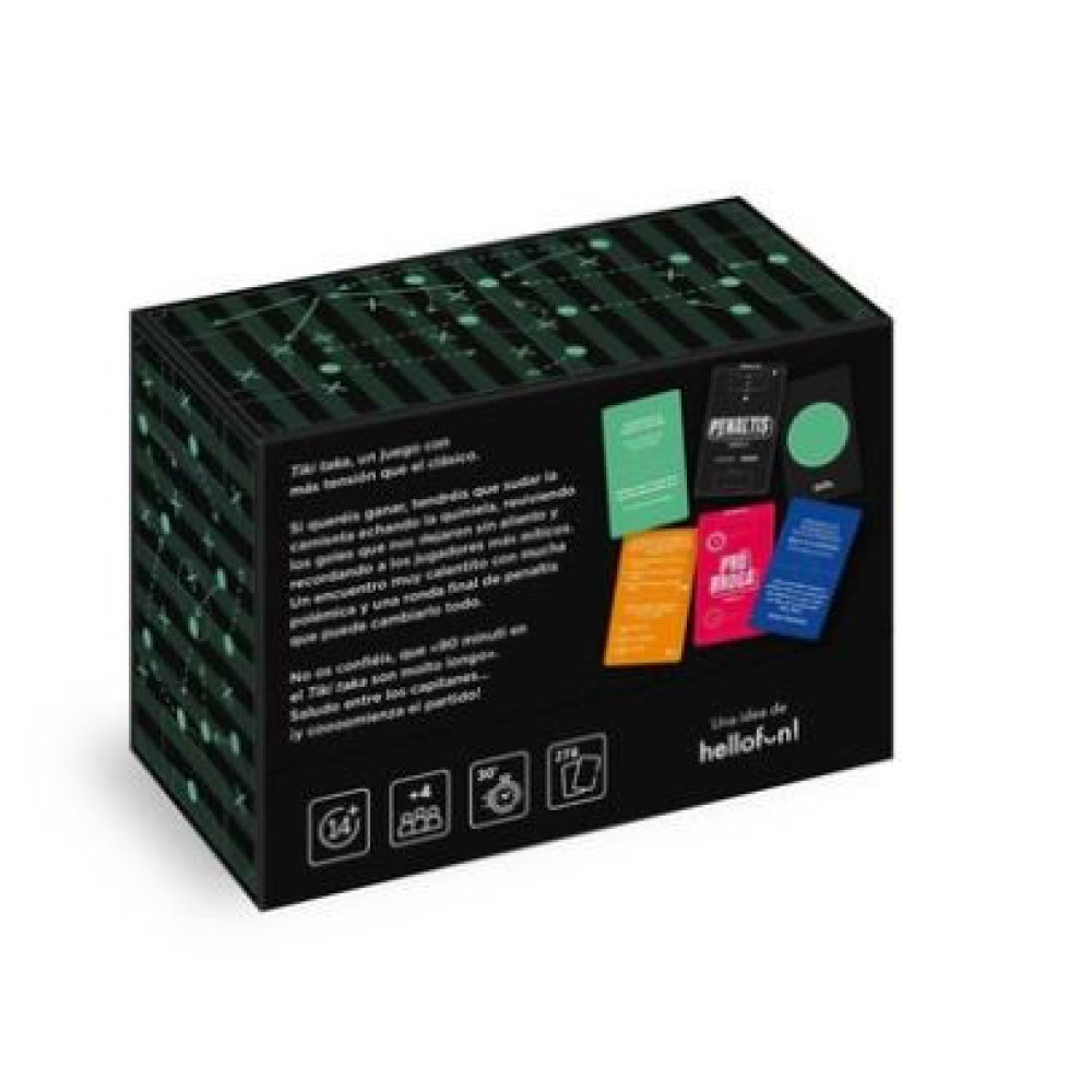 Tiki taka, un juego con más tensión que el clásico. Si queréis ganar, tendréis que sudar la camiseta echando la quiniela, reviviendo los goles que nos dejaron sin aliento y recordando a los jugadores más míticos. Un encuentro muy calentito con mucha polémica y una ronda final de penaltis que puede cambiarlo todo. No os confiéis, que «90 minuti en el Tiki taka son molto longo». Saludo entre los capitanes? ¡y coooomienza el partido! Número de jugadores: +4. Tiempo juego: 30 minutos. Edad; +14.