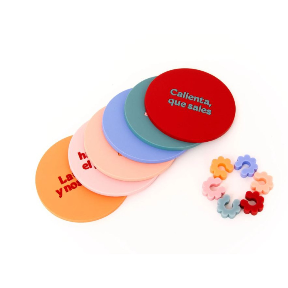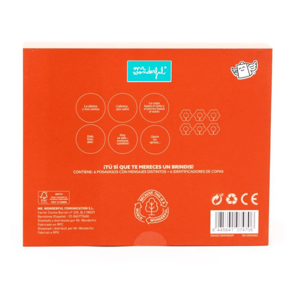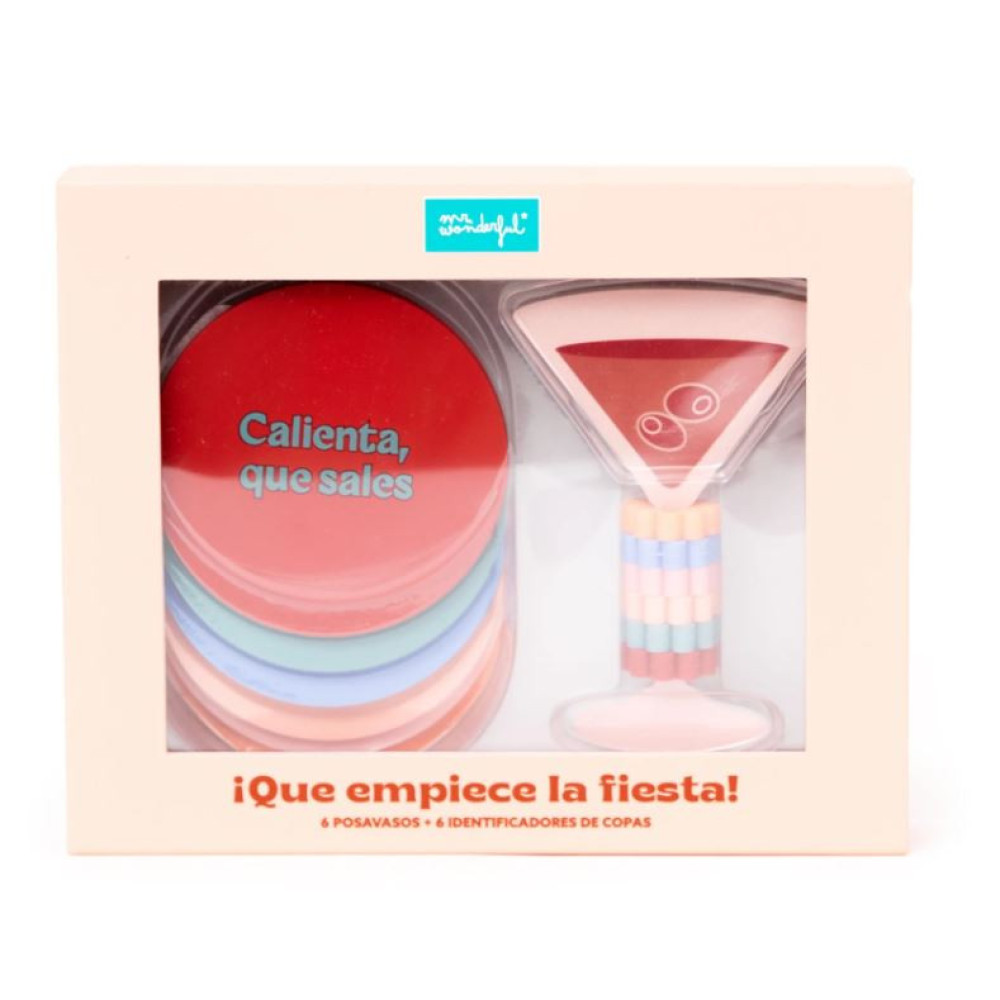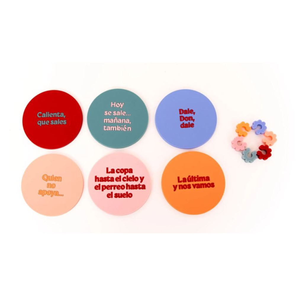 Set perfecto para regalar o autoregalarse, compuesto por 6 identificadores de copas y 6 posavasos, cada uno de ellos con un divertido mensaje en español: