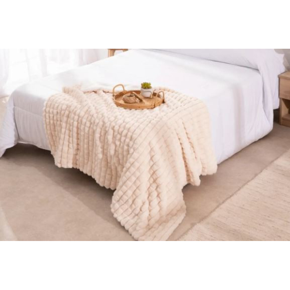 Manta Amber, en color crema, de 130x160 cm, de la marca Karamelo. La manta Amber es el complemento perfecto para aportar confort y elegancia a tu hogar. Su diseño acogedor y elegante la convierte en el complemento ideal para cualquier sofá o cama. Interior de pelo para un confort y calor superiores. Combina suavidad, ligereza y un excelente poder térmico, ideal para los meses de invierno.