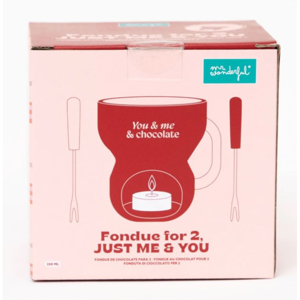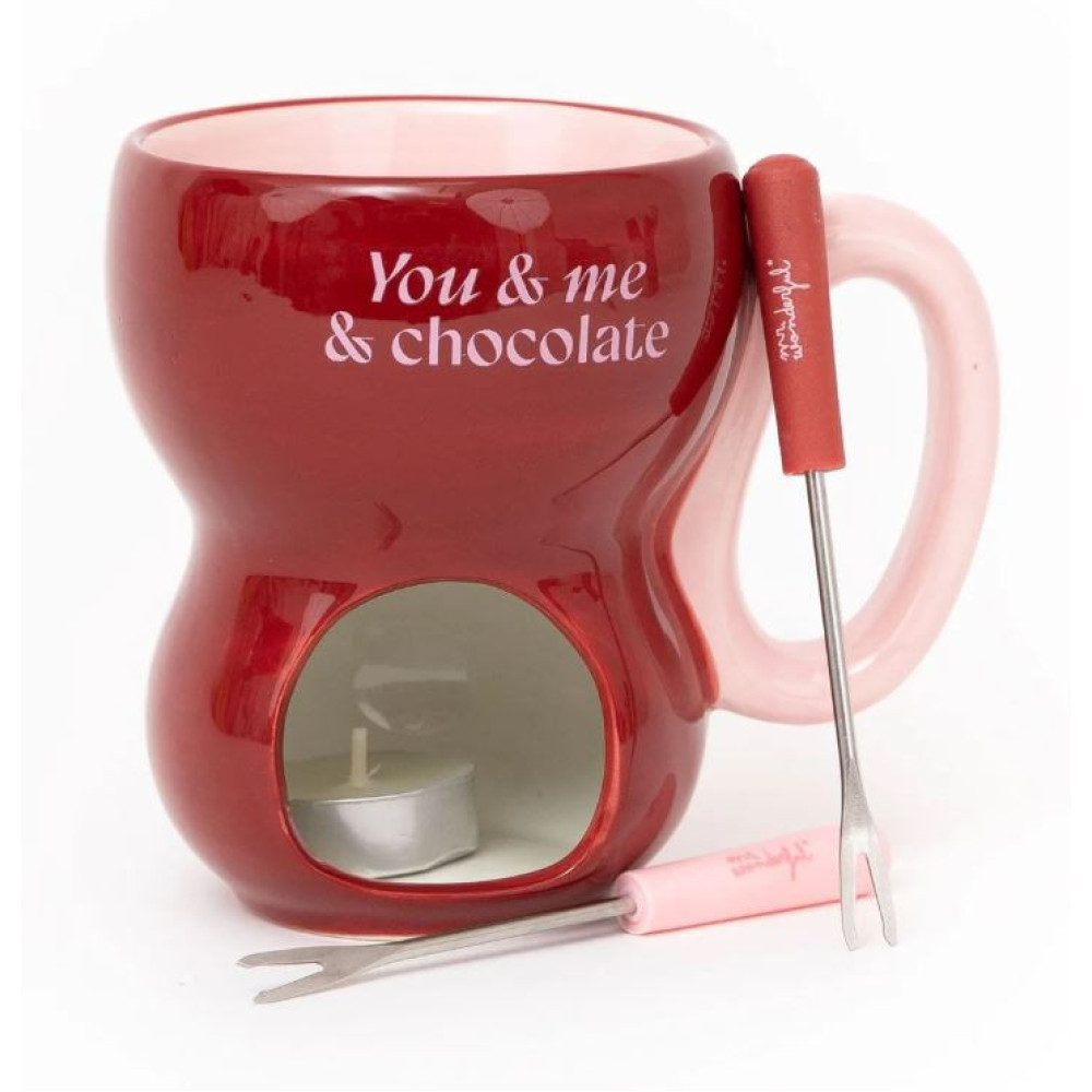 Set para disfrutar de una deliciosa fondue de chocolate para dos personas. Incluye una fondue de dolomita de 20 cl de capacidad, en la que fundir el chocolate, colocando una velita de té en el agujero practicado en la misma fondue con ese fin. Asimismo, incluye también una velita de té de cera de parafina en carcasa metálica y dos pinchos de acero inoxidable de 12 cm de largo, con mango de plástico, ideales para pinchar y sumergir en el chocolate las piezas de fruta, bollería o lo que se desee.