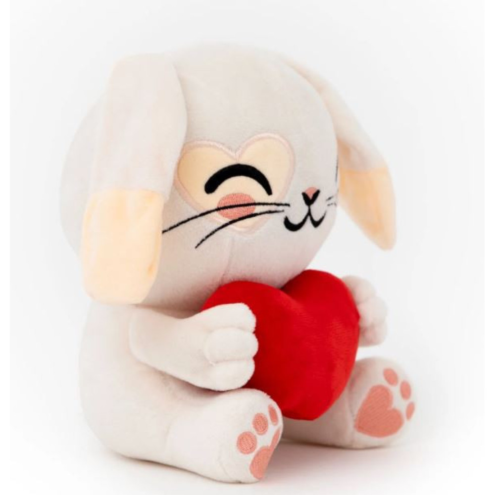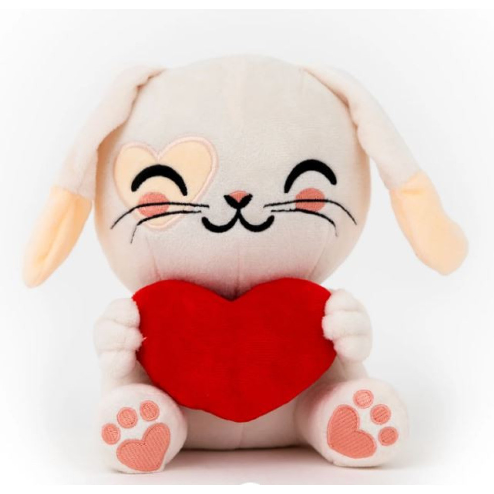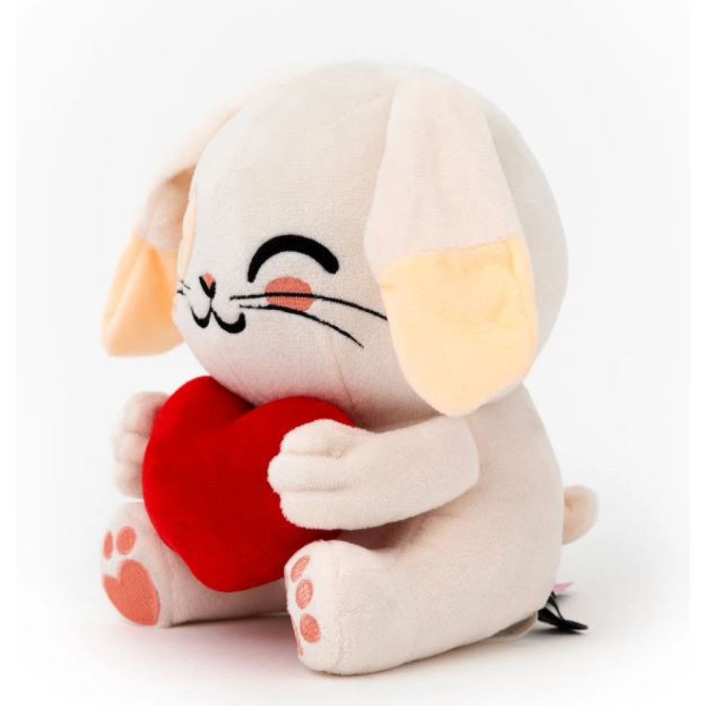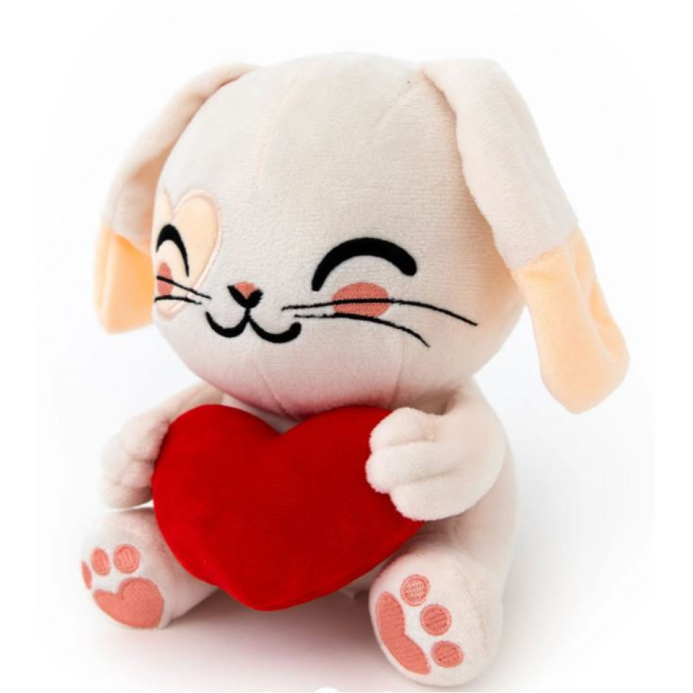 Dulce y suave conejo belier de peluche, el típico conejito doméstico de orejas largas. Se presenta sentado y agarrando un corazón en sus manos, lo que lo hace ideal como regalo en San Valentín.