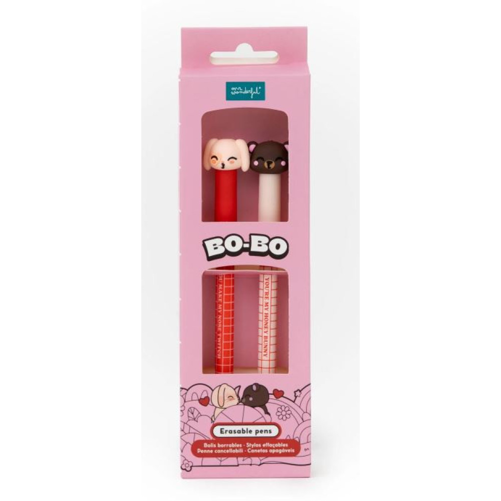 Set de 2 bolis borrables Bo-Bo, con mensajes de amor y un bonito personaje Mr. Wonderful en el extremo de cada uno de ellos. Ideales para regalar a la pareja.