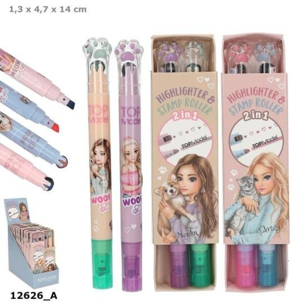Marcador y estampador: ¡Estos rotuladores de TOPModel son ambas cosas a la vez! Cada set se compone de 2 rotuladores: verde/lila y rosa/azul. Uno de los dos rotuladores estampa corazones y el otro patitas mediante sistema de rodillo.