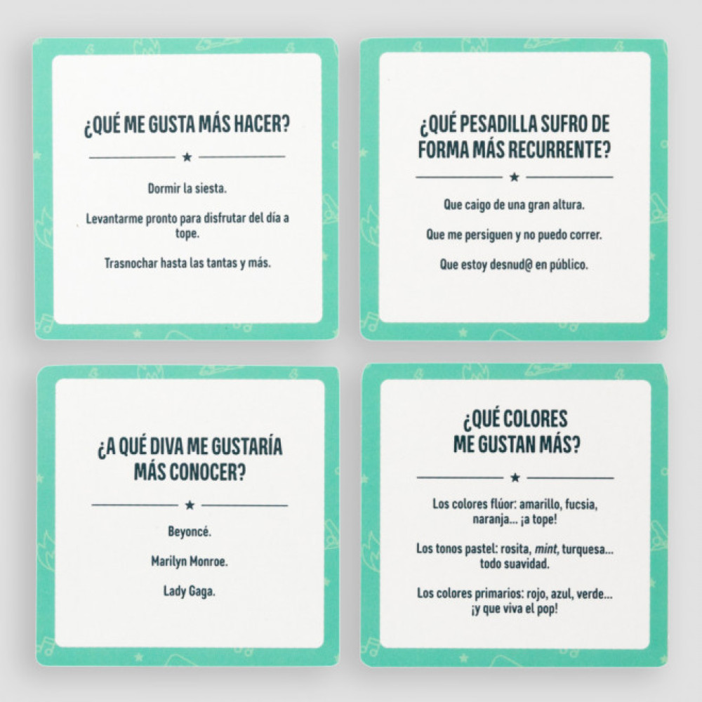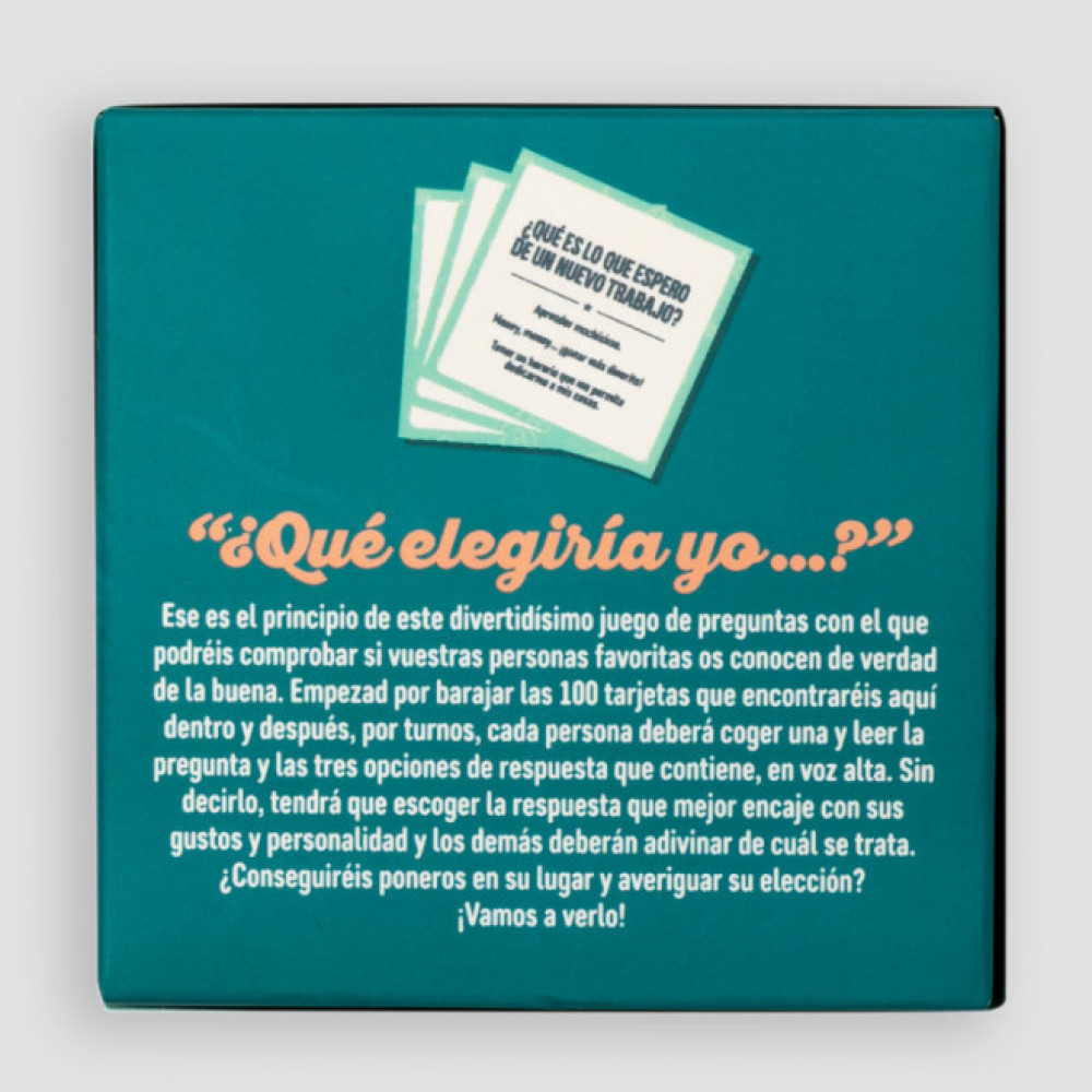 Consta de 100 cartas de 8 x 8 cm, en cada una de ellas hay una pregunta distinta que el jugador deberá efectuar al resto de participantes para ver si ellos saben qué elegiría él o ella en esa situación.